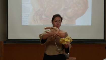 受精したとき、わずか0.1mmだった命が1週間ごとに「砂粒」→「ごま」→「米粒」→「あずき」大になっていくこと、赤ちゃんがどのようにして外の世界に出てくるのか、ということなどを、模型や人形、映像やスライドを使って、わかりやすくお話ししていただきました。