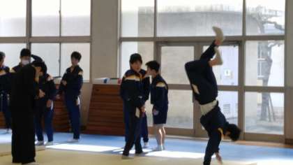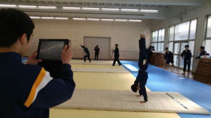 いよいよタブレットを使って撮影を開始しました。なかなか美しい演技ですね。片手側転を披露する生徒もいました。