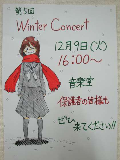 明日12月9日(火)16:00〜音楽部による『第5回Winter Concert』が開催されます。毎年、多くの友達や保護者、教職員が参加し、クリスマス気分を満喫しています。写真は、2年生の音楽部員が作成したポスターです。是非、ご参加ください。
