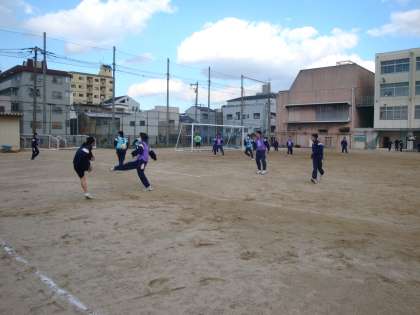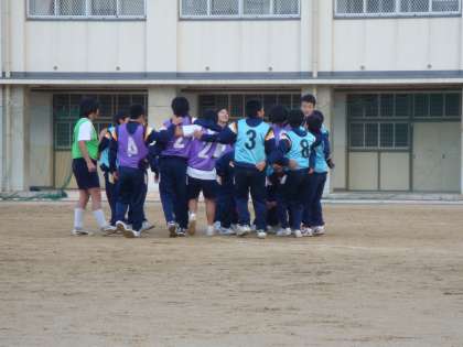 左の写真は、試合前の円陣です。男女混合チームの試合も行われました。