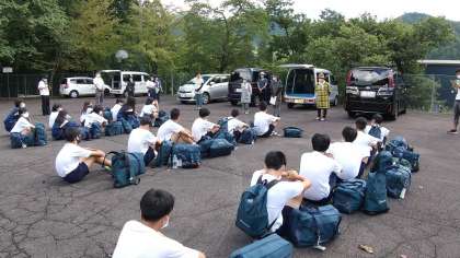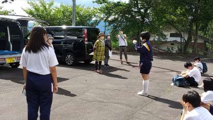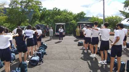 バスで白山文化の里長滝、牛滝第2体育館へ移動しました。これから民泊体験となります。対面式を行いました。