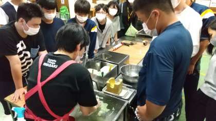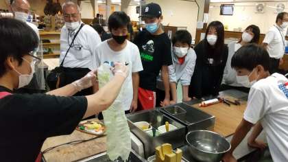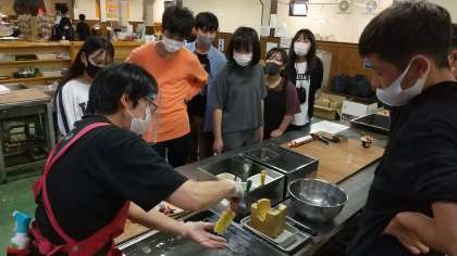 お店の方の実演も見せていただきました。70度の色付きのロウと40度のお湯からエビと野菜の天ぷら、レタスがマジックのように現れました。