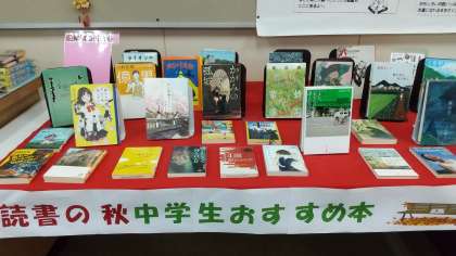 写真は、図書室入り口と特設コーナー「読書の秋 中学生おすすめの本」です。先日生徒の皆さんは、サタデイワークに積極的に参加して、学力アップを目指してください!