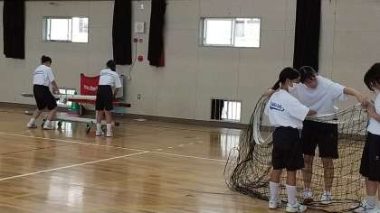 4つの班に分かれ、指示された線に一列に並び少しずつサーブを打つ位置を遠くしていきました。これが見た目以上になかなか難しそうです。だんだんとコツをつかんでいきました。