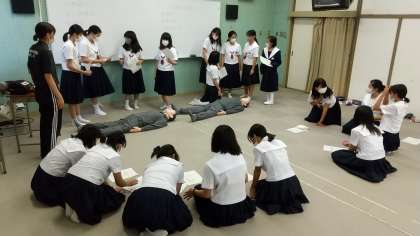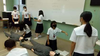 9月25日(金)3限、1年生女子保健「救急救命」の様子です。写真のように4つのグループに分かれ、グループ内でも胸骨圧迫をする人、AEDを取りに行く人など交代して取り組みました。