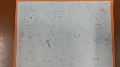 昨日、美術部員が10月カレンダーを持ってきてくれました。今回も1年生作品です。10月と言えば「ハロウィン」。月夜です。ここは墓地のようですが、コウモリもお化けも猫も?カボチャもみんなそれぞれかわいい顔をしています。
