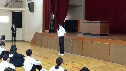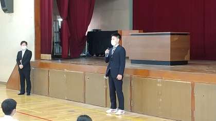 10月12日(月)の全校集会の様子です。今日から、本校卒業生で桃山学院教育大の男子学生1名が、教育実習生として実習を行います。期間は、10月30日(金)まで、教科は保健体育です。