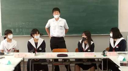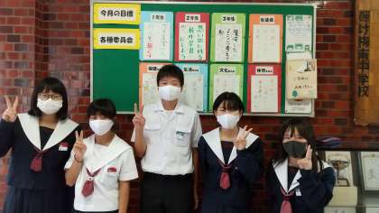 間もなく任期を終えるということで、最後に3年生役員3名から挨拶がありました。そして、中央委員会終了後、掲示した「今月の目標」前に役員に集まってもらい、記念撮影をしました。