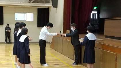 10月19日(月)の全校集会の様子です。まず、「大阪市立中学校総合文化祭」に出品した生徒の表彰です。代表して3年生5名に表彰状が渡されました。他に1年生10名、2年生18名にも表彰状が届いています。作品は、追って紹介します。