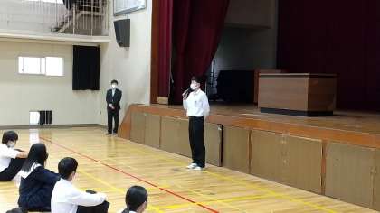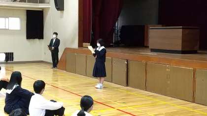 続いて、選挙管理委員会からの連絡。今日から後期生徒会役員候補の公示となります。生徒の皆さんは、経験の有無を問わず積極的に立候補してください。
