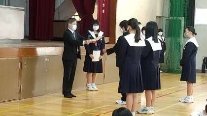 その後、新しい生徒会役員(5名ですが本日は1名欠席)に認証状が手渡されました。