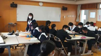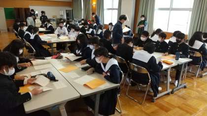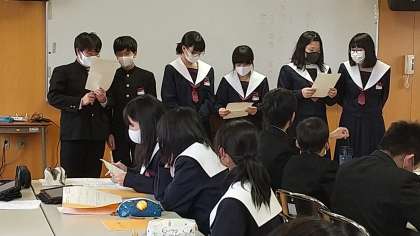 2年生では来週、「様々な地域の特色や様々な仕事に触れ、知見を広げ、自主自立の取り組みとする」等の目的で班別フィールドワークの校外学習を計画しています。学級を超えて「ビジネス」「アート」「歴史」「スポーツ」「国際」「建築」「自然」の7つのテーマのグループに分かれ、行き先を考えました。このプレゼン大会でそれぞれのグループからのプレゼンがありました。