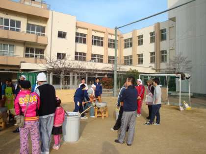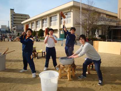 土曜授業の一環として、PTAや地域の方々の協力のもと小学校が行っている餅つき大会に、本校柔道部員も参加させていただきました。慣れないながらも、実際の餅つきも経験させていただき、おまけに美味しい豚汁やお餅もいただきました。小学校と中学校の連携を色々な機会を通じて行えたら、さらに結束が強まると感じました。PTAや地域の方々、本当にありがとうございました。「ごちそうさまでした!」
