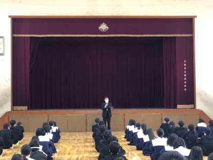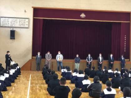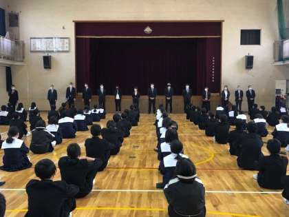 始業式に先立ち、着任式で新転任の教職員の紹介がありました。始業式では校長から入学式での在校生代表の「歓迎のことば」、新入生代表の「誓いのことば」の紹介等がありました。
