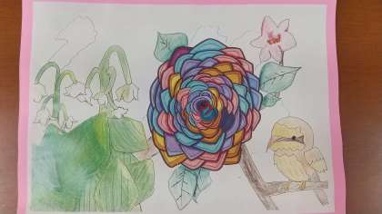 まず中央のカラフルな花が目を引きます。じっと見ていると立体的な貼り絵のように見えます。この圧倒的な存在感の花はバラでしょうか。周囲には左にスズラン、右にサツキ、可愛らしいスズメが描かれています(違っていたら教えてください)。