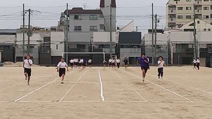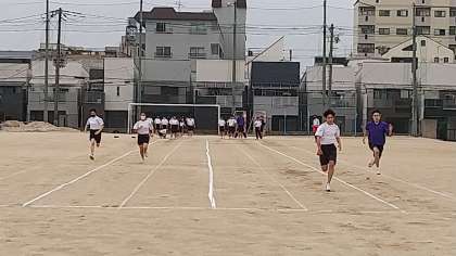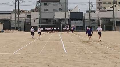 曇り空の下、50m走の計測がありました。男女同時に計測しています。コロナ対策のため、マスクを着用したままの生徒もいます。