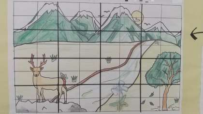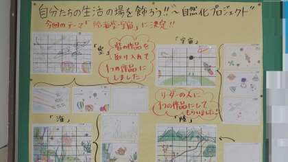 自分たちの生活の場を飾ろう!!今年で3回目になる3年生美術の「自然化プロジェクト」の今年のテーマは「陸・海・空・宇宙」に決定、原画が職員室前に掲示されています。