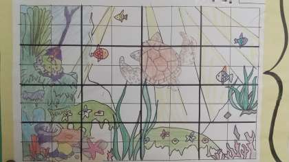 皆の作品を取り入れてリーダーの生徒が1つの作品にした、ということで「陸・海・空・宇宙」それぞれ1作品ずつに仕上がっています。写真2枚目は「陸」、3枚目は「海」です。
