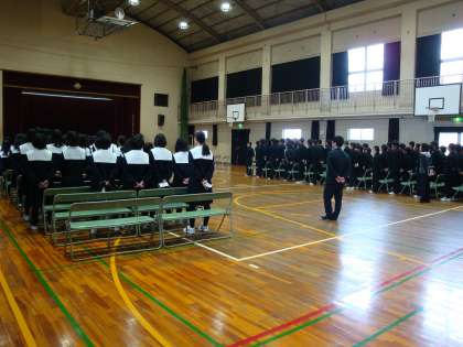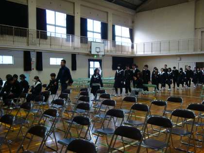 明日は、午前中に卒業式の予行があり、午後からは準備があります。今日は、朝の集会で1,2年生の式練習(立居振る舞いや歌練習)がありました(左の写真)。右の写真は、3年生の入場の練習場面です。当日は、子どもたちが立派な式にしてくれると信じています。卒業生の新しい門出を是非とも多くの方々で祝福してあげてください。卒業式のお知らせはこちら⇒