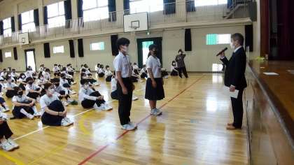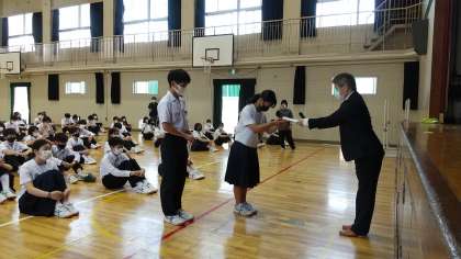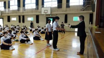 認証状は代表して3年生1組の学級委員長2名に授与されました。学級委員長はじめ各学年、各学級の学級委員の皆さんはより良い学校生活づくりのためによろしくお願いします。