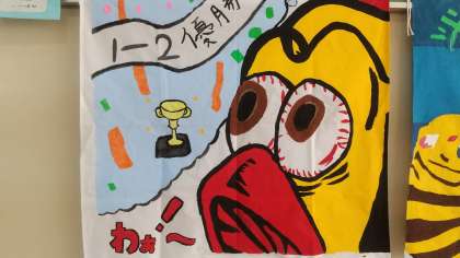この絵で工夫した部分は、目です。とても強く描きました。そこには、「みんなで協力して優勝するぞ!」という強い気持ちが込められています。
