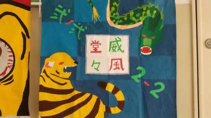 今回、私がデザインした旗は、威風堂々と描いた旗です。虎は私たちのクラスを表していて龍はその虎と対立をしている様に描きました。そして威風堂々という意味は、態度や雰囲気に威厳が満ちあふれて立派なさま、です。