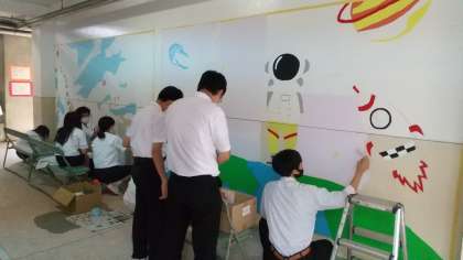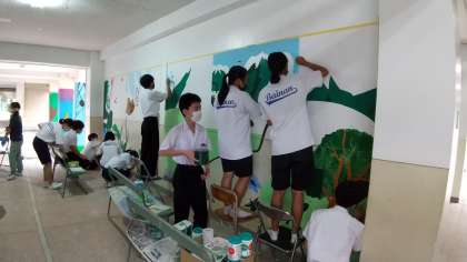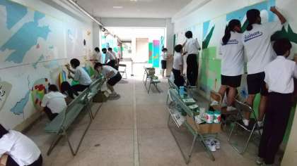 遠目からの写真です。隣のピロティで先生からの説明を聞くところから始まって、絵の具やいす等の準備、着色開始と実にてきぱきと進めていました。