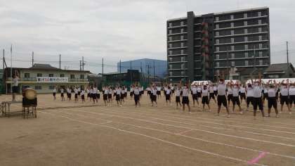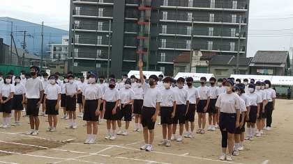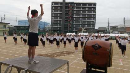 体育委員の掛け声で基準の生徒が手を上げ、全体が体操隊形に開き、ラジオ体操が始まりました。みんなしっかり声も動作もそろって見ていても気持ちのいいラジオ体操でした。