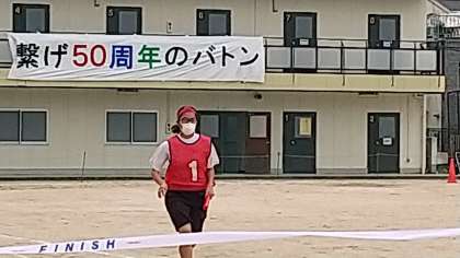 第3走者とアンカーは200m走ります。3年生が1位でバトンを受け、そのまま1着でゴールしました!