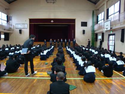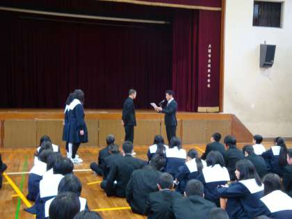 本日、平成27年度1学期の始業式を行いました。最初に新転任の教職員の紹介(写真左)があり、その後、校長先生からのお話がありました。そして生徒会の認証式(写真右)に引き続いて、最後に、学年所属・担任の先生方、職員の方々の紹介が校長先生よりありました。穏やかな雰囲気の中、良いスタートが切れました。校長先生のお話はこちら⇒1学期始業式校長講話