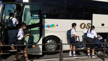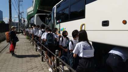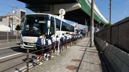バス下部のトランクににボストンバッグを入れ、お弁当の入ったリュックを持って乗車します。バス乗車時には手指消毒も行いました。