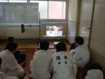 写真は、柔道部です。ビデオ映像を使っての技の研究の様子です。技をイメージすることは、とても大切なことです。
