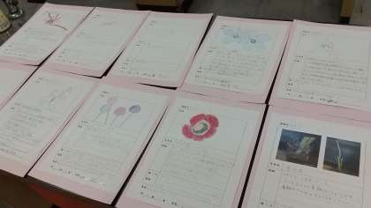 1年生「植物調べ」です。身近なところでスイカ、カーネーション、他にはラフレシアなどが見られます。