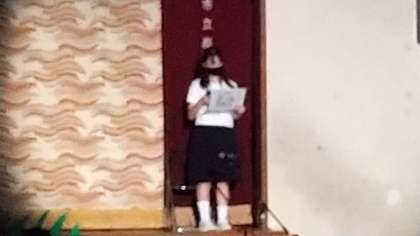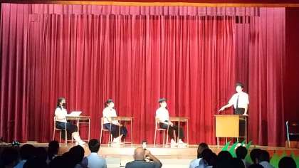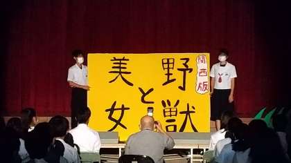 2年生学年劇「美女と野獣」です。教室内で女子生徒が「美女と野獣」の読書をしていて、読んでいる物語の内容が舞台で表現されるという構成になっています。