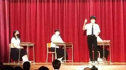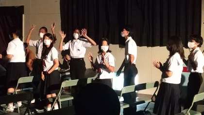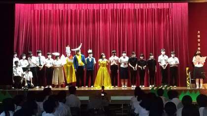 劇が終わって挨拶、本番は観客席で見ていた、きれいな背景や衣装など大道具や小道具を作ってくれた裏方のみなさんも紹介されました。2年生は、昨年舞台が無かったので初めての取組となりましたが、よくがんばりました!