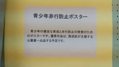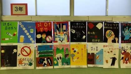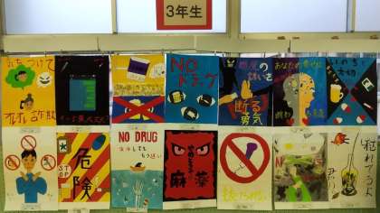 3年生「青少年非行防止ポスター」です。例年のことですが、ずらっと並べられた色とりどりのポスターは壮観です。
