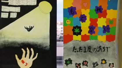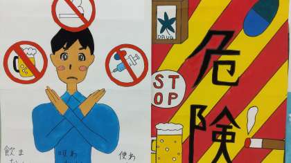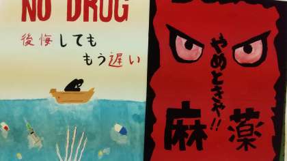 「一度落ちればそこは地獄」「もどれない たった一度の過ちで」「NO DRUG 後悔してももう遅い」「やめときや!!麻薬」「飲まない 吸わない 使わない」「STOP 危険」がインパクトのある表現で描かれています。