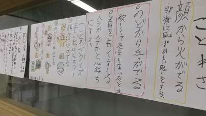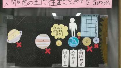 日ごろの学習の成果を「プレイルーム作品展」として展示しました。「人間は他の星に住むことができるのか」では、月、金星、水星の距離、水、大気、重力、温度について調べています。結論としては、火星が「住める可能性あり」で、他の星は不可能、地球は「奇跡の星」ということができるとのことです。他には「敬語の使い方」「ことわざ」「四字熟語」についてまとめられていました。