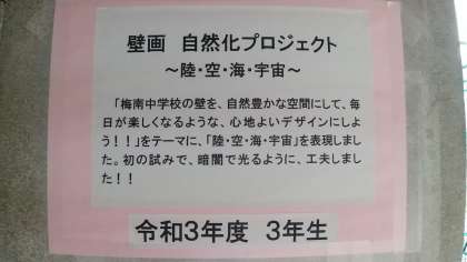 これまでメイキングを紹介してきましたが、C棟(3年生校舎)1階、製図室横の壁にある3年生「壁画 自然化プロジェクト〜陸・空・海・宇宙〜」です。