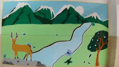 写真は「陸」と「空」。「陸」では、春かな草原と流れる川、遠くに山、青空が描かれています。植物や生物(遠くに鳥も浮かんでいます)も描かれていてまさに自然という壁画です。