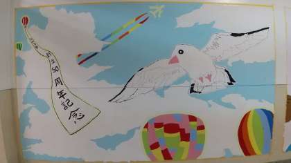 「空」では、大空で翼を広げる鳥、虹を描くはるか上空の飛行機、気球から「令和3年 創立50周年記念」の大きな垂れ幕も見られます。50期生による50周年記念の作品です。