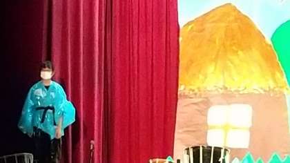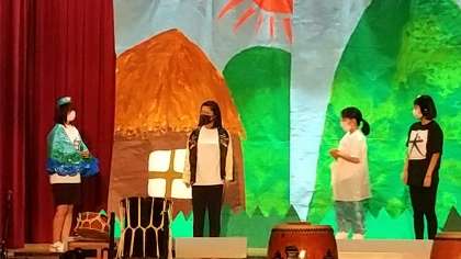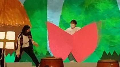 誰もが知っている劇、「桃太郎」が始まりました。川でお婆さんに見つけられ、桃から生まれた桃太郎は、犬、鳥を従え鬼退治に行こうとします。