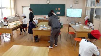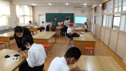 家庭部です。被服室で活動しました。現在の部員は2年生2人だけなので、たくさん来てくれてよかったです。