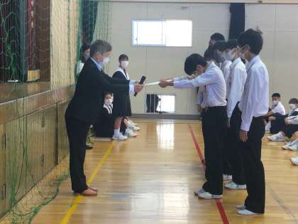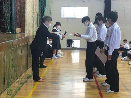 先日開催された、大阪中学駅伝選考会の表彰を全校集会で行いました。