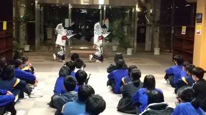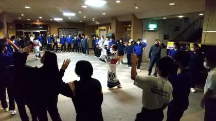 食事の後は1階ロビーで「郡上おどり」体験です。お二人に指導していただきました。あいさつ、お手本の後、さっそく練習にとりかかりました。