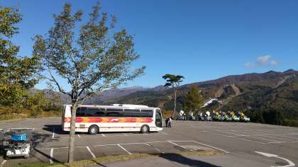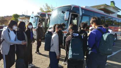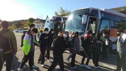 バスの運転席真上くらい、雲がかかってちょうど見えないところに白山があります。隣の山にうっすら雪が見えます。体験によって場所が異なるので、バスに体験別、クラス混合で乗車しました。