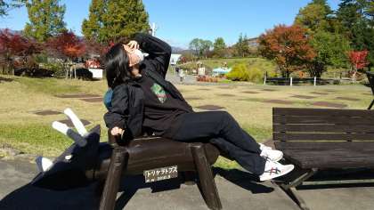 かわいいトリケラトプスのベンチでくつろいでいるところを逃さず撮らせてもらいました。