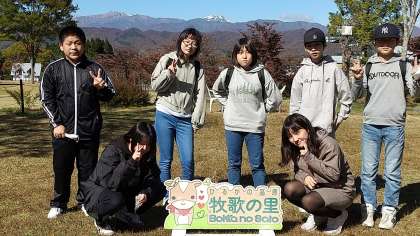 写真2枚目は、遥か後方に冠雪した白山をバックにしたものです。「今日は風が割りと強いのでくっきり見える」とのことでした。たまたま通りがかったピエロも飛び入り参加しました!