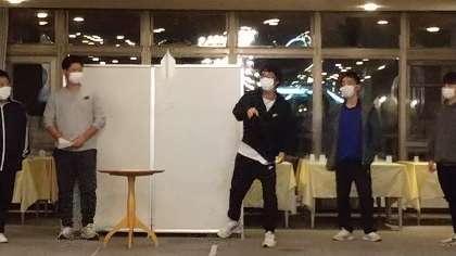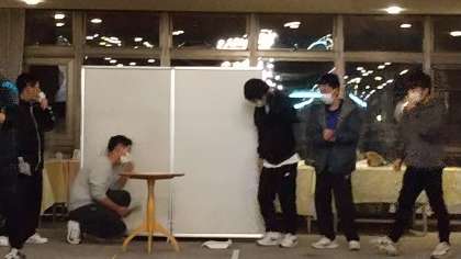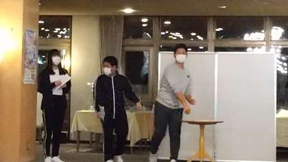 写真1枚目、手を離れた紙飛行機がふわっと上向きに浮かんでいるのが中央やや左に見えます。紙飛行機は向きを選手の方に変えそのまま落下・なんとマイナスの記録が誕生しました!これで余裕が出来たのか、力みの無いフォームで、全出場者中最高の8メートル超えの記録も続いて誕生しました!