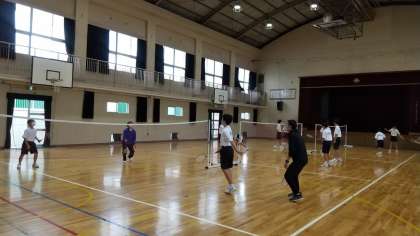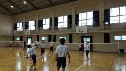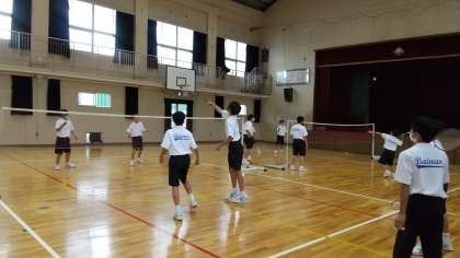 体育館で男子がバドミントンをしています。授業後半、ゲーム形式で取り組んでいました。